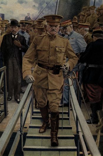 Major General John J. Pershing, appointed to organize and command the American forces in France, is shown landing in France on June 12, 1917. French officers and officials of high rank are there to welcome him. His arrival is recognized as an epoch-making date in the war, for it foreshadows the creation of a great American Army in France.