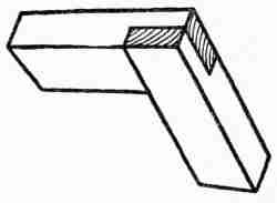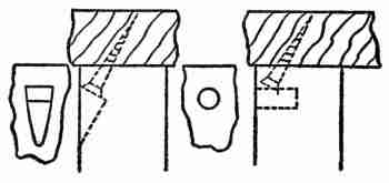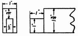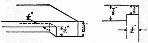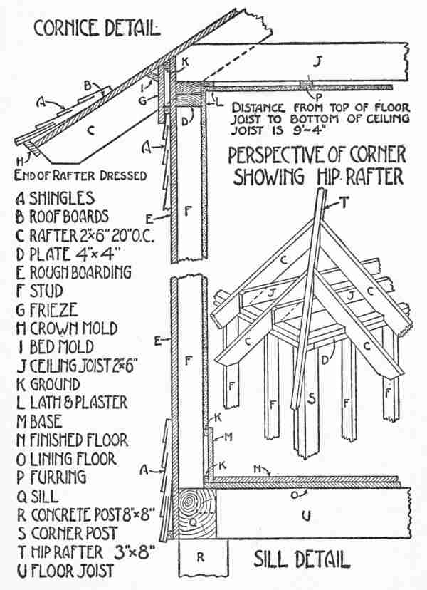 Setting Batter Boards, Posts, and Sills.—The first step in actual construction was to mark off the lot and set the batter boards. These were made by driving three stakes to form a right angle about four feet from the point where each of the four main[26] corners of the house was to be located. Two rough boards, one for each side of each angle, were nailed horizontally to each of the four sets of stakes, with their upper edges all brought to the same level. It is very important to set these batter boards with accuracy, since their function is to carry the lines which mark the dimensions and level of the ground floor. In the present instance their first use was to locate the concrete posts on which the sills of the house were to rest. Twenty-two of these posts, which were 4 feet long and 8 inches square, were put in position by first setting moulds or boxes, the interior dimensions of which were those of the posts, 3 feet deep in the light soil and filling them with a mixture of concrete and crushed rock. It was not thought necessary to remove the moulds after the hardening of the concrete. In fact, the sills were framed and placed in position resting on these boxes before sufficient time had been given for the concrete to harden. The sides of the boxes, however, were scored with a saw cut so that they could be easily broken off just below the ground, exposing the projecting ends of the concrete posts for about one foot. The sills were of 6 by 8-inch first quality spruce. They were set on the 6-inch face, the two long sills being spliced over posts,[27] using a long halved joint. Mortise and tenon joints, draw-bored and pinned, were used at the corners. The floor timbers of 2 by 8-inch spruce were gained into the sills with the top faces flush with the top of the sill and crowning (i. e., bending) upward if at all. The spacing of the floor timbers was taken off at the sill on a strip of furring—spruce, 7⁄8 of an inch thick by 2 inches wide—which was moved out to the centre near the line of bridging and lightly nailed, bringing crooked timbers into line. The bridging was then nailed in, the outside last to prevent springing the sills.