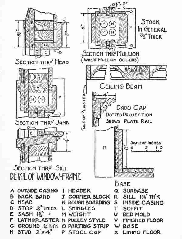 The window frame details are shown in a series of cuts (Plan C) which for the sake of completeness are drawn to show also the interior finish, not usually represented in the framing drawings. A detailed description of these features of construction is unnecessary, since the dimensions and relations of the various elements and the technical terms by which they are known are all clearly indicated in the illustrations.