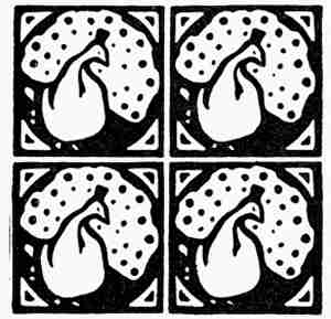 Fireplace Tiles.—Some of the tiles illustrated in Plate XIV would be entirely appropriate for facing a border around the opening of a fireplace. This is especially true of the middle design shown at the top of the plate, on account of the lines which project through the corner design nearly to the edges of the tile. This makes it especially adapted to repetition in a facing or border.