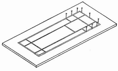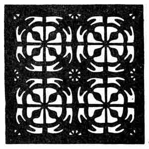 The openings are cut with a penknife, care being taken to make as clean a cut as possible. Japanese paper, of pale green, orange, or some suitable light colour, is pasted under the openings. The process of pasting is one that requires some care. It is well to paste only a portion of the pasteboard at a time taking care not to use more paste than necessary and not to let any get over the edges of the openings. The paper should be pressed on while the paste is still moist, and the paper[361] itself should, of course, not be pasted at all. It should be placed with colour side next to the openings.