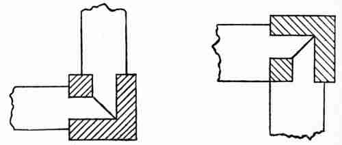Referring to the accompanying sketch (Plan A) it will be noticed that the corner posts and centres were not mortised into the sills, but were simply butted on and heavily nailed or spiked. There was a time when carpenters would have regarded such a method as altogether wrong; but those were the days of great corner posts and heavy studding, placed two or three times as far apart as is the practice now. It was thought that placing the studs 16 inches on centres, which is the common practice in modern house framing, removed the necessity of mortising into the sill. Mortising is still recognized, however, as a good thing to do and is sometimes practised by first-rate carpenters.[29] Plan A also shows how the outside walls were trussed over openings; and Plan B shows how the corners of the building were tied by the lapping of the double plate, and how the ceiling timbers and rafters were placed on the top of the plate.