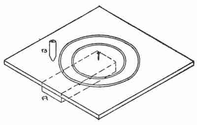 This problem introduces engraving and enamelling, two interesting but somewhat difficult operations. The process to be carried out is as follows: Using 12-gauge copper, saw the outline, and apply the design[354] for the part to be enamelled to the copper by sketching it with a pencil or transferring it by means of carbon paper. Then strengthen the pencil or carbon lines by scratching lightly with a scratch awl. Imbed this fob in pitch, either in a pitch bowl or in a small quantity of pitch placed on a piece of board clamped to the bench or table. Using an engraving tool, remove the copper from the spot to be enamelled to the depth of 1⁄32 of an inch. It is well to have the bottom of the spot reasonably level but not necessarily smooth and the sides slightly undercut. Before applying the flux, clean, by pouring a small quantity of concentrated nitric acid over the cut and immediately rinsing it off under the water tap. Flux should be kept in a closed jar under water after grinding, and taken out as needed on the tip of a small strip of copper previously cleaned with acid. Enough flux should be applied to cover the bottom of the spot to be enamelled; but the depth of the spot must not be filled up.
