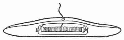 Carefully scrape with a knife the portions of the surface where the pin is to be attached (shown in the drawing), select a steel pin of desired length, scrape the surface of the little disk attached to one end of it, apply to this disk a little soldering paste by means of a small stick, and then, with a gas (or alcohol) blowpipe, melt on a bit of soft solder, which should cover the whole disk. Now place the copper, outside face down, on an asbestos pad, applying the soldering paste to the central portion, place the disk with its bit of solder on this portion of the copper, and fuse as before.