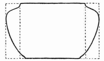 The Lining.—The fern dish requires a separate inner dish or lining with a hole in the bottom of it like that in the ordinary flower pot. This feature forms the unique part of the problem. Generally speaking, the presence of this lining seems to call for a little closer approach to the vertical in the sides of the outer bowl; and yet some latitude is allowable, as is shown in the right hand dish illustrated in Plate XIII following, which is somewhat similar in profile to that illustrated in the accompanying drawing. This drawing shows the development[312] of the problem as applied to a round fern dish. Much freedom, however, may be used in the plan as either the round or the rectangular fern dish seems to give satisfaction. The half section in the drawing shows a very narrow space between the inner and outer bowls at the top edges. This adds greatly to the good appearance of the completed fern dish. The sides of the inner dish are made vertical, since it is necessary for it to be easily removed.