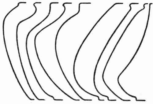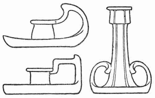 The Design.—This problem introduces several points in design that need to be especially emphasized. The candlestick should be of such size that it will easily support the average candle without putting the user to great inconvenience in fitting it by paring it off or melting it down. It is necessary to provide a lip to catch the stray drops of wax that will run down the sides of the candle; and it will be a convenience to have this supplemented by a slight dishing of the base if the candlestick is to be carried about. If a handle is to be added it should seem to be a natural outgrowth of the candlestick itself, as was explained in the discussion of handles for vases; and it should, at the same time, offer a place for a firm and comfortable grasp. The accompanying drawing shows how handles may be designed really to form a part of the candlestick and at the same time, by means of a sharp bend or elbow at the top, to provide a natural place for the thumb to assist in grasping the handle.