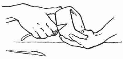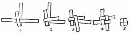The series of cuts given below show the progressive steps in forming the knot, which should finally take the shape of Figure 5. After it has been formed the thongs are passed through holes punched in the cover and leaves of the pen wiper, and secured by a second knot formed on the back, resembling[331] Figure 4 with the ends cut as close as will leave them securely tied.