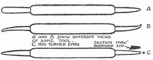 Tools.—The simple tools required for tooling leather may be purchased at small cost, or they may be made from cheap nut picks by filing these to shape, polishing them, and buffing them. The illustrations show two different tools, each double pointed. A and B are different views of the first tool; C is the second tool. The narrow pointed end of the first tool is for outlining and working into corners. The broad, flat end is for smoothing down and for general use; the broad tool should be used whenever possible. The round point on the left end of C is used for outlining and transfering[324] the design to leather. The right hand end of C is known as the background tool. It is cupped out like a nail set, as indicated by the lengthwise section just above and by the end view at the extreme right; in fact, a nail set may be used for the same purpose. The background tool, however, is to be used sparingly. If used to excess, especially on large surfaces, the result is likely to have a mechanical and "shoppy" appearance.