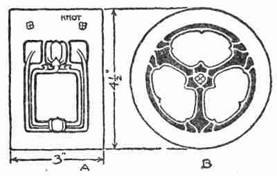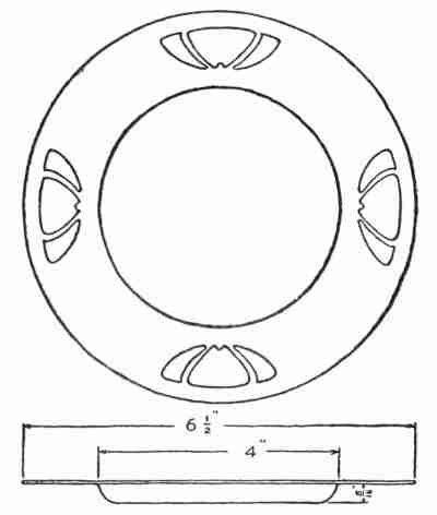 There is a limited field for metal work in home decoration; but there are some things of metal that combine beauty and utility to a remarkable degree and, in their making, introduce us to most interesting operations. Beginning with the gate, which may be of wrought iron, or with the door knocker, which may be of antique brass, we may find in every home problems of design involving work in metals. Ornamental hinges, key[346] escutcheons, fastenings of various kinds, andirons, and other accessories of the hearth, lamp holders, card trays, crumb trays, bon bon dishes, and many other useful things that may be made in attractive forms readily suggest themselves. How some of these may be made is suggested in the following simple problems: