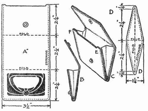 The purse is lined throughout with leather. It has bellows ends, as shown in the perspective at C and in the end view at B. The pattern of the bellows end shown in D is intended to fold in the middle, bringing both ends of the leather together and thus giving an end of double thickness. With thin leather, such as is used in the present instance, this pattern is practicable. If thicker leather be used the bellows must be made of single thickness. In this case the pattern would simply be like that shown in the lower half of D.