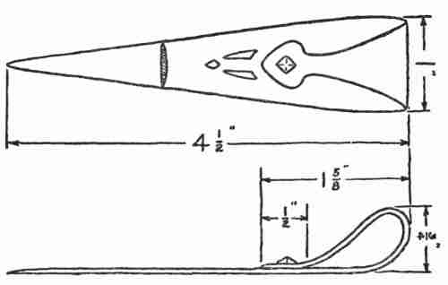 This requires the same kind of material as the letter rack and the same operations, with the addition[348] of riveting. After the stock is cut out, trimmed and trued up at the edges, an outline of the design is pasted on, as in the previous problem, and the design cut out. The top is then bent over and riveted with a copper tack, having shaped the head of the tack in the vise before inserting it. While the tack is being riveted the finished head should be protected by placing it on a lead block. Finally the edge should be filed to the shape shown in the cross section, and the whole cleaned and polished.