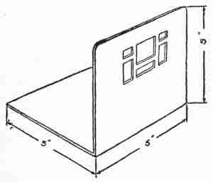 Twenty-gauge copper is required for this problem. The operations are similar to those already described;[352] but the cutting and bending are much more difficult. After determining the design it will be necessary to[353] make a drawing showing fully developed surfaces, as illustrated in the detail of the corner. The four corners must be marked and cut exactly as shown in the drawing. A piece of hard wood is then cut to the size of the top, 5 inches square in this case, to be used as a form on which to bend down the sides and turn the flanges. If the corners are correctly cut the parts will fall naturally into place, to be bored and riveted, as the drawing plainly shows. In order to protect the tablecloth, the under side of the rivet holes should be countersunk so that the ends of the rivets may be finished smooth and flush with the under surface. As an additional protection, a felt mat may be glued on the bottom.
