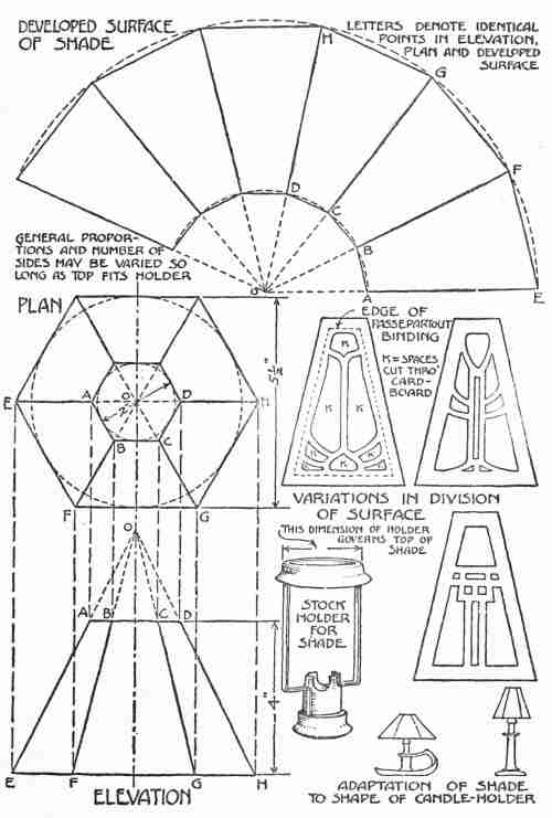 When the paste is dry the card-board should be lightly scored on the lines AE, BF, etc., and bent on these lines, bringing the sectors together into the form of the shade and fastening them at the top and bottom temporarily with a bit of passe-partout binding. If the binding is of the ordinary width (7⁄8 of an inch), it should be cut lengthwise into two strips of equal width, to be used for mounting the edges. No attempt should be made to run the binding along more than one edge. The separated strips should then be cut the exact length for each top and bottom edge and applied one at a time. Then the side edges are bound, with the apex of the angle at the middle of the binding. When the binding is firmly fastened it is carefully trimmed off at the top and bottom.