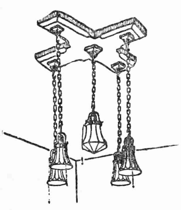 Another design for the dining-room of the same house and much easier to construct is also illustrated. It will be observed that the square form instead of the circle is carried out consistently in the woodwork and metal caps. These caps and the chains are in natural brass of a dull finish. The shades are of ground glass, decorated with a flower design in heavy black lines. The central light has a larger shade than the others, wholly enclosed. In this one is placed a red incandescent[364] bulb for use whenever such decorative effect is desired.