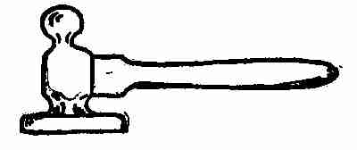 Ball for end of knocker: Take a piece of 5⁄8-in. round iron any length. Fuller in as shown by the sketch. Rivet this to the centre of the knocker, the pin on the end of the ball projecting far enough through to make a rather large rivet head on the other side. The rivet head acts as a knocker. The bolt is pushed through the escutcheon plate, then the[412] knocker is ready to be placed on the door. Sometimes these balls are made long enough to go through the door and fasten in the same way as the bolt.