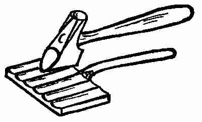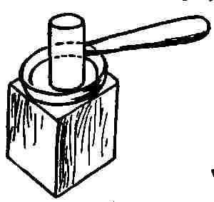 A wooden mallet is often used in place of the heavier hammer. If a light stroke is needed it can be used without danger[9] of marring the metal, as wood is so much softer than the metal itself.