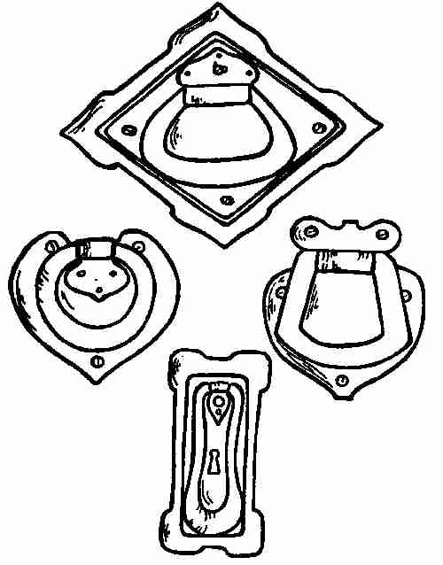 Door pulls are used as knockers, too. In general they take the place of door knobs, and are used in[416] conjunction with a door plate. They are made of soft steel or iron.