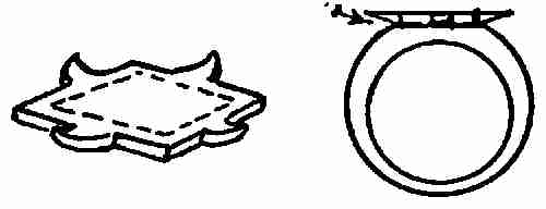 Bossing up: Place the disc while cold on the hollow wood block and drive down from the under side with the hammer, bending in the inside. This makes the outside slightly oval, so that the bearing will be on the outer surface. The depth of this concave should not exceed 1⁄4 in. A few designs are here given.