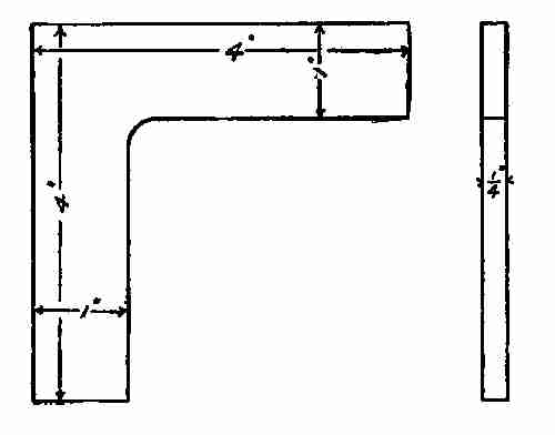 While bending this into shape keep the circle a little larger than the drawing calls for. The circle is very easily reduced, while if it was made too small in the beginning one would have to straighten the whole piece out to increase the size. Therefore, it is best to work it large until finished. Wide stock like this is easily twisted out of shape, so that it is very difficult to bend it up in a circle of this kind. It is hard, too, to change any twist that may be worked in.