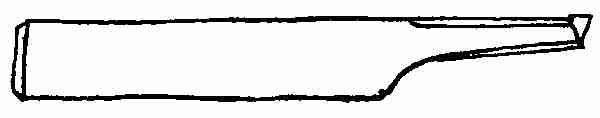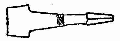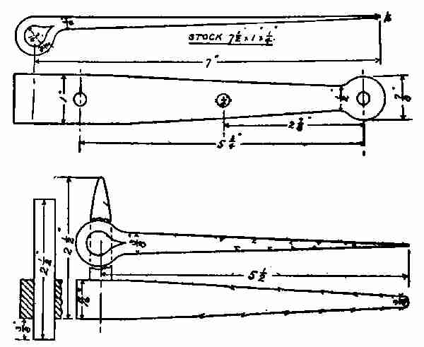 Rod: The rod is welded at one end to the handle. The other end is flattened out to be riveted on to[373] the shovel blade. To do this, upset the extreme end of the rod back about 1 in. and about 3⁄4 in. in diameter. Flatten this out and shape it up as shown by the sketch. Holes are drilled in for 1⁄8 in. rivets.