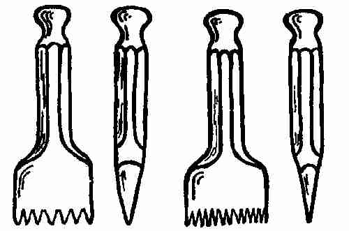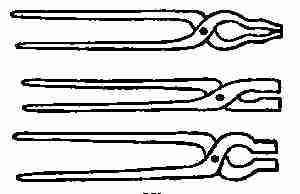 Tongs are made, as you know, for the purpose of picking up pieces of wood or coal to place them in a stove or open fire. One must keep their use in mind when making the ends of the tongs fitted to do this work, so the ends may be flat, round, claw shaped, concaved, etc. The finish will be the same as the finish on the andiron, without any attempt at ornament. The surface should[377] show the hammer marks, but be quite free from lumps.