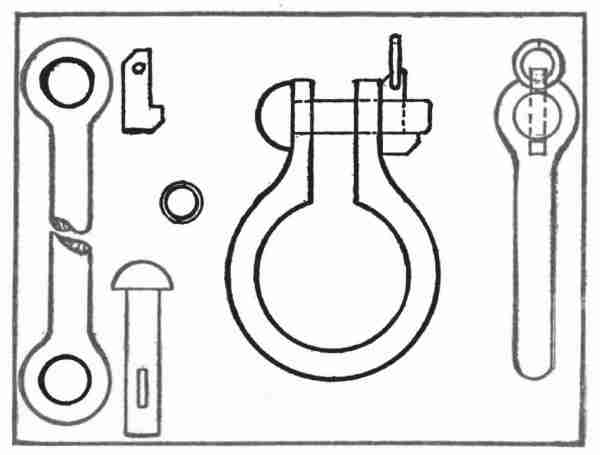 Stock: Escutcheon plate, 1⁄8 in. soft steel, 21⁄4 ins. round. Bolt, 1⁄2 in. square on the bar. Ring, 1⁄4 × 61⁄2 ins., all of soft steel.
