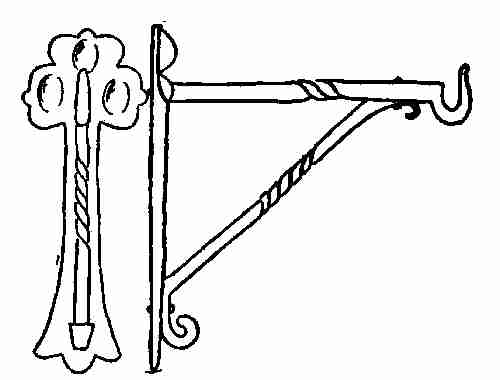 Support: Select a bar the right length and twist it in the middle. Flatten the ends down and bend the little curves as shown. This is drilled for a[395] 1⁄8-in. rivet, then placed in position. Holes are marked in the hanger and in the back. Rivet the support in place. Be careful to have the hanger at right angles to the back. If you do not, the effect is spoiled, no matter how good the rest of the workmanship may be.