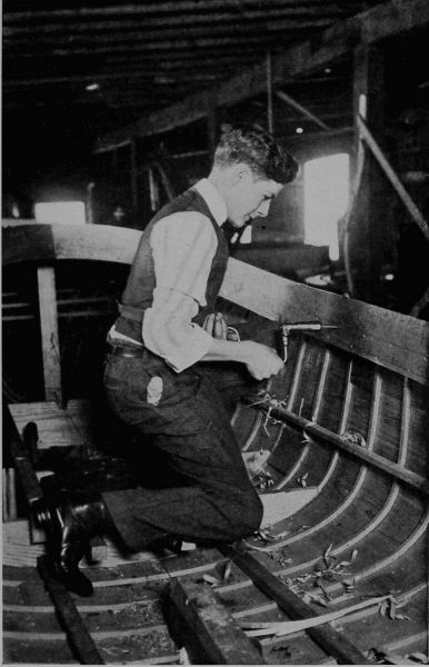 "All right," said George; so the three of them went over to the poultry house and Fred began by taking out the two or three small windows, and removing the doors by unscrewing the hinges. George's desire to pull, tear, and smash the old material was held in check by Fred, who advised him to be careful, and not break or destroy anything that could be used. After the doors had been taken off and laid nicely away—"to be used on the boat house"—and the windows and frames placed in a dry spot, Fred began to remove the old siding, or clapboards. He found this a rather difficult job, as they were nailed on with old-fashioned [13] wrought-iron nails which could not readily be drawn, and, in trying to get the boards loose, the ends kept breaking and splitting; so he stopped, went inside the building, and took off the lining there; this also was a little difficult to do, but, as the boards were an inch thick, he did not split many of them.