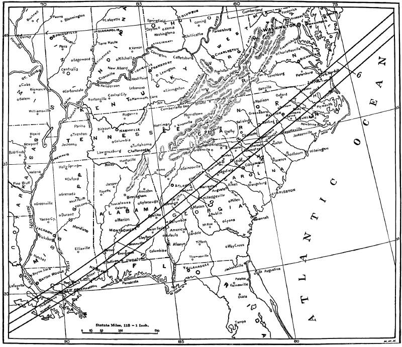 The track of May 28th enters the United States in southeastern Louisiana; passes over New Orleans, La., centrally; over Mobile, Ala., which is on its southern edge; over Montgomery, Ala., on the northern edge; over Columbus, Ga.; south of Atlanta, Ga., which lies about twenty-five miles to the north of it; near Macon, Milledgeville, and Augusta, Ga., Columbia, S. C., Charlotte, N. C.; over Raleigh, N. C., which is ten miles north of the central line; and over Norfolk, Va., fifteen miles north of the center. The track is about fifty miles wide in all parts, and the duration of the eclipse2 varies from one minute and twelve seconds near New Orleans to one minute and forty-four seconds near Norfolk, on the central line. These durations diminish from the maximum at the middle of the track to zero at the northern and southern limits of it, so that an observer must be stationed as near the central line as possible in order to see much of the eclipse. The population of several of the above-mentioned cities is at present as follows: New Orleans, 242,000; Mobile, 31,000; Montgomery, 22,000; Columbus, 20,000; Atlanta, 66,000; Raleigh, 13,000; and Norfolk, 35,000. It is evident that with very little exertion more than 500,000 people can see this eclipse. It is most fortunate that the track passes near so many cities, because, with their facilities for the accommodation of visitors, many will be induced to undertake excursions with the purpose of taking in this rare sight, and a little enterprise on the part of railroads and transportation companies might easily increase the numbers. If people will go to a parade, yacht race, or an exposition, and consider themselves paid for their expenses, then surely they will find in this great spectacle of Nature not only an object of wonder and beauty, but also one of peculiar instruction in many important branches of science. All educators who can induce their pupils to make such an expedition will implant a love of astronomy in many impressionable minds which will become a source of pleasure to them for the rest of their lives.