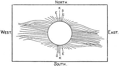 There are many existing theories to account for the phenomenon of the sun’s bright appendage, called the corona, which is visible only during eclipses, on account of the absorbing effects of the earth’s atmosphere on its light. Is it electrical, or is it magnetic? Is it composed of fine stuff ejected from the sun, or of meteoric dust falling upon the sun? Is it merely an optical effect, as some suppose, or is it a portion of the newly discovered radiant matter streaming off to enormous distances into space? The answer to these questions is eagerly sought through observation, photography, and every other possible means, on the occasion of each total eclipse.