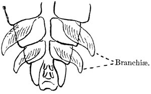 A number of neuropterous insects whose early stages are passed in the water are furnished with branchial tracheæ or false gills. These consist of filaments springing from the sides of the abdominal segments. In the early stages of certain dragon flies the rectum supports epithelial folds which are filled with fine tubes from the tracheal system. Among certain aquatic insects belonging to the order of Hemiptera the creatures reach out the hinder portion of the body to secure air. Dr. Myall, in his very interesting book on the Natural History of Aquatic Insects, says: “A Nepa or a Ranatra may sometimes be seen to creep backward along a submerged weed until the tip of its breathing tube breaks the surface of the water.”
