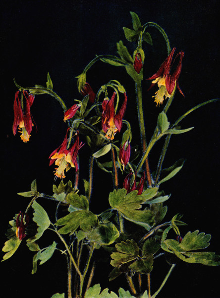The genus Aquilegia includes about twenty species and an endless number of varieties, produced by the skill and intelligence of the gardener. The United States can claim the prettiest of all the species of this widely distributed group. One species is the Wild Columbine (Aquilegia Canadensis) of our illustration. It is common everywhere. Here it is found covering rocky hills, softening the harsh gray of the rocks with its delicate foliage; there it enlivens the woodland borders with its nodding and pretty scarlet flowers, which are lined with bright yellow. In the woods it is frequently encountered, though not as robust in its growth, as if in this sheltered position less strength is required. Another species, and the most elegant of all the Columbines, is the blue Rocky Mountain form (Aquilegia coerulea). It is at home in the Grand Canon of the Colorado, where its wild grace and untrammeled native beauty is unsurpassed. Among the other species that should be mentioned are the Yellow Columbine (Aquilegia crysantha) of the Western States, and its sister, also yellow, the Pubescent Columbine (Aquilegia pubescens) of the Death Valley of California. The Rocky Mountain and Yellow Columbines furnish the finest garden forms and are the parents of several beautiful varieties. Europe has its common form (Aquilegia vulgaris) and also Alpine species, which, though outranked by our native species, are the originals of many of the single and double varieties of the garden.