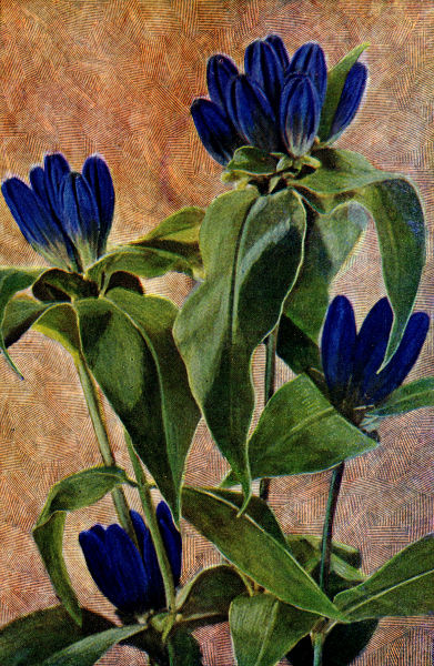 The closed Gentian has leaves with rough edges and a narrow base. The flowers are blue or occasionally white, closed at the mouth, forming an inflated, club-shaped corolla, with stripes on the inside. They are arranged in clusters on the ends of the peduncles or flower stems and are from an inch to an inch and a half in length. Both the fringed and the blue Gentian bloom during the autumn months and are among the most attractive forms that mark the close of the floral season.