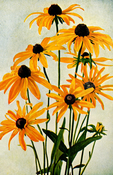 The daisies, of which the ox-eye daisy is a well-known example, are garden and field favorites. As already indicated, they are kin to the sunflowers. The word daisy is a contraction of the old English words "dayes eye," that is, the eye of day, meaning the sun, as indicated in the verse from Chaucer. There are a great many flowers known as daisies and again a given one has a number of popular names. For instance, Rudbeckia hirta (see illustration) is variously designated yellow daisy, black-eyed Susan, nigger head, golden Jerusalem and ox-eye daisy.