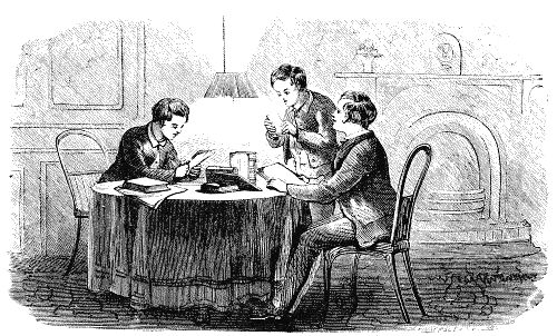 The room which they now occupied was situated in St. Mark's Place, which forms the eastern portion of Eighth Street. It was a front room on the third floor, and was handsomely furnished. There was a thick carpet, of tasteful figure, on the floor. Between the two front windows was a handsome bureau, surmounted by a large mirror. There was a comfortable sofa, chairs covered with hair-cloth, a centre-table covered with books, crimson curtains, which gave a warm and cosey look to the room when lighted up in the evening, and all the accessories of a well-furnished room which is used at the same [15] time as parlor and chamber. This, with an excellent table, afforded a very agreeable home to the boys,—a home which, in these days, would cost considerably more, but for which, at the time of which I write, sixteen dollars was a fair price.
