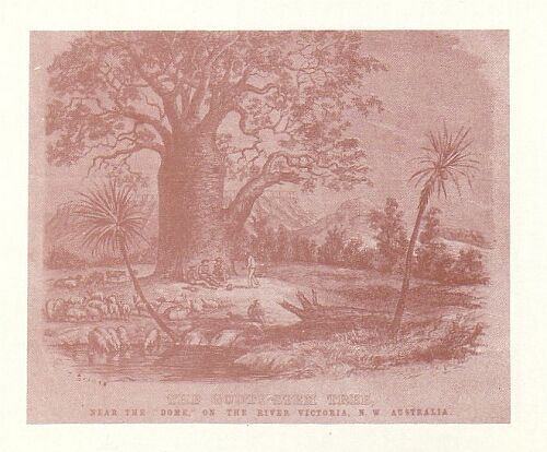 From the Nive River a north-north-west course was pursued through a nearly level sandy country, covered with a scrub of acacia, eucalypti, bottle-tree, etc., which offered great impediments to our progress, till within six miles of the Victoria River, when we suddenly emerged from the scrub on to open downs of rich clay soil; but the drought had been of such a long continuance that the whole of the vegetation had been destroyed and swept away by the wind, leaving the country to all appearance an absolute desert. The bed of the Victoria was scarcely ten yards wide, and perfectly dry, so that it was only after a prolonged search along its course that a small puddle of water was found in a hollow of the clay flat, and near it, fortunately for our horses, a little grass growing in widely scattered tufts.