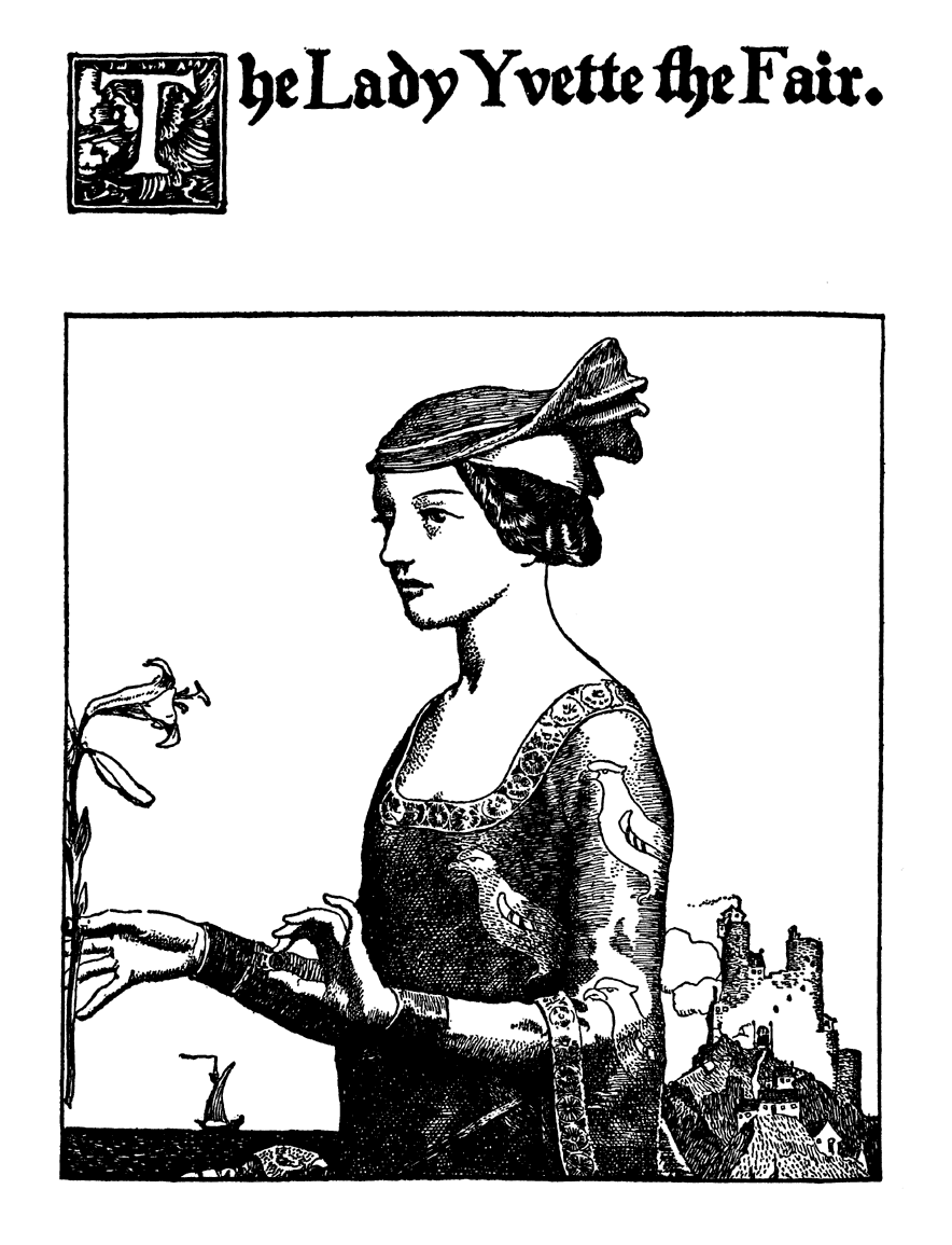 The windows of the apartment stood open, and a cold wind came in thereat from off the sea; and there stood a couch in the middle of the room, and it was spread with black velvet; and the Lady Yvette lay reclined upon the couch, and, lo! her face was like to wax for whiteness, and she neither moved nor spake, but only lay there perfectly still; for she was dead.