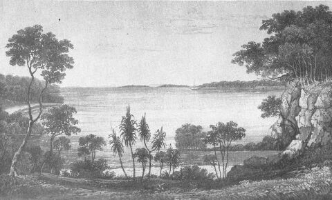 Upon leaving the cutter we crossed St. George's Basin which appeared to receive several streams on the south side and landed on a small wooded islet for bearings; from which the summits of Mounts Waterloo and Trafalgar bore in a line. About two miles farther on the banks of the river again contracted and trended to the south-east on so direct a course that, from the distant land being hidden by the horizon, the river bore the appearance of being a strait. We were now twenty-two miles from the sea and as there was every appearance of this proving a considerable stream it was honoured by the title of Prince Regent.