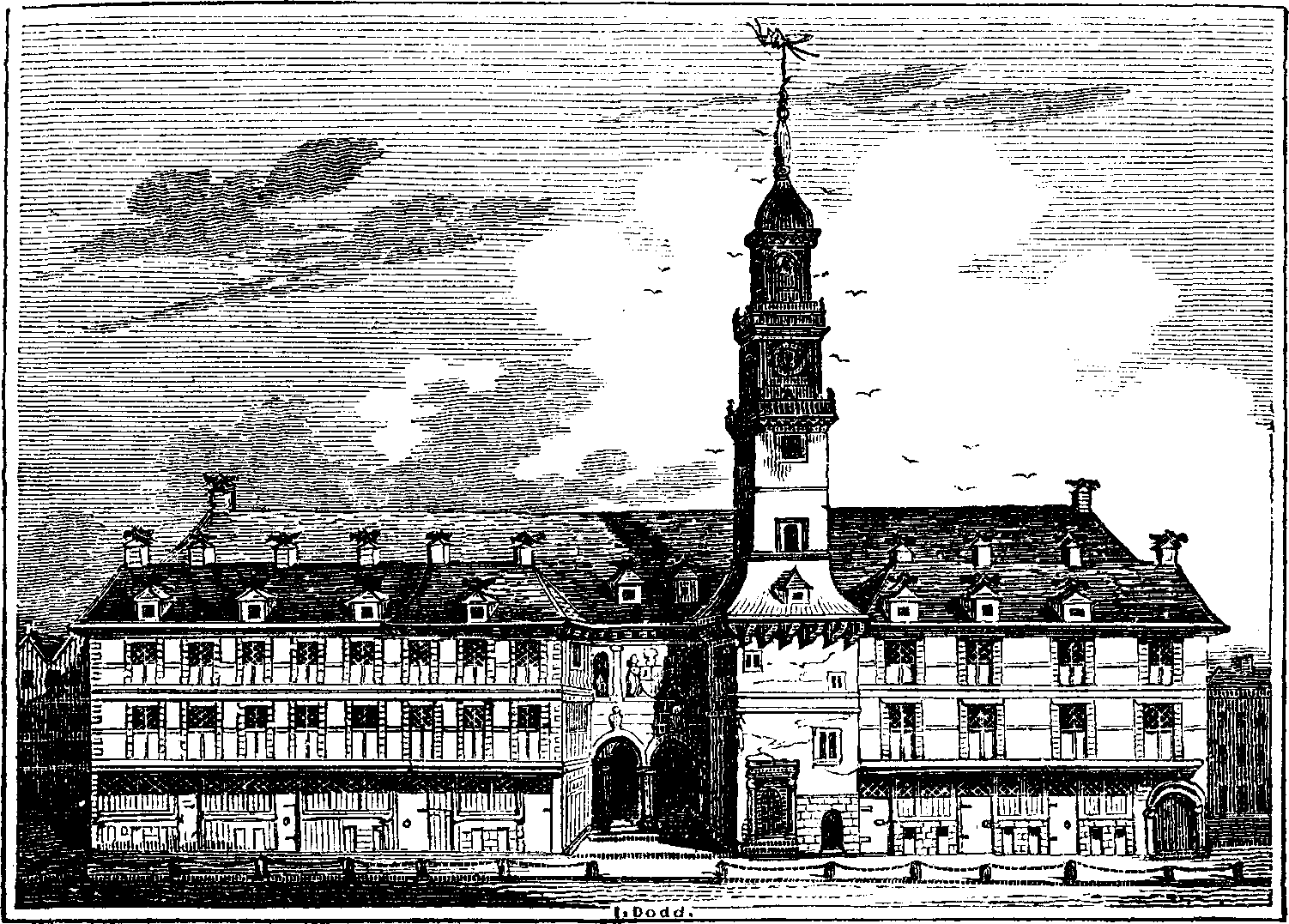 The plan adopted by Sir Thomas, in [pg 258] the formation of his building, was similar to the one at Antwerp. An open area was inclosed by a quadrangle of lofty stone-buildings, with a colonnade as at present, supported, by marble columns of the Doric order, over which ran a cornice, with Ionic pilasters above, having niches between, containing statues of the English Sovereigns. The entrances were from Cornhill and Broad-street. Over the first, between two Ionic three-quarter columns, were the Royal Arms, and on either side were those of the City and Sir Thomas; on the north side, but not exactly in the centre, rose a Corinthian pillar to about the same height as the tower in front surmounted with the grasshopper. In every other respect it was similar to the south, of which the previous engraving is a view.