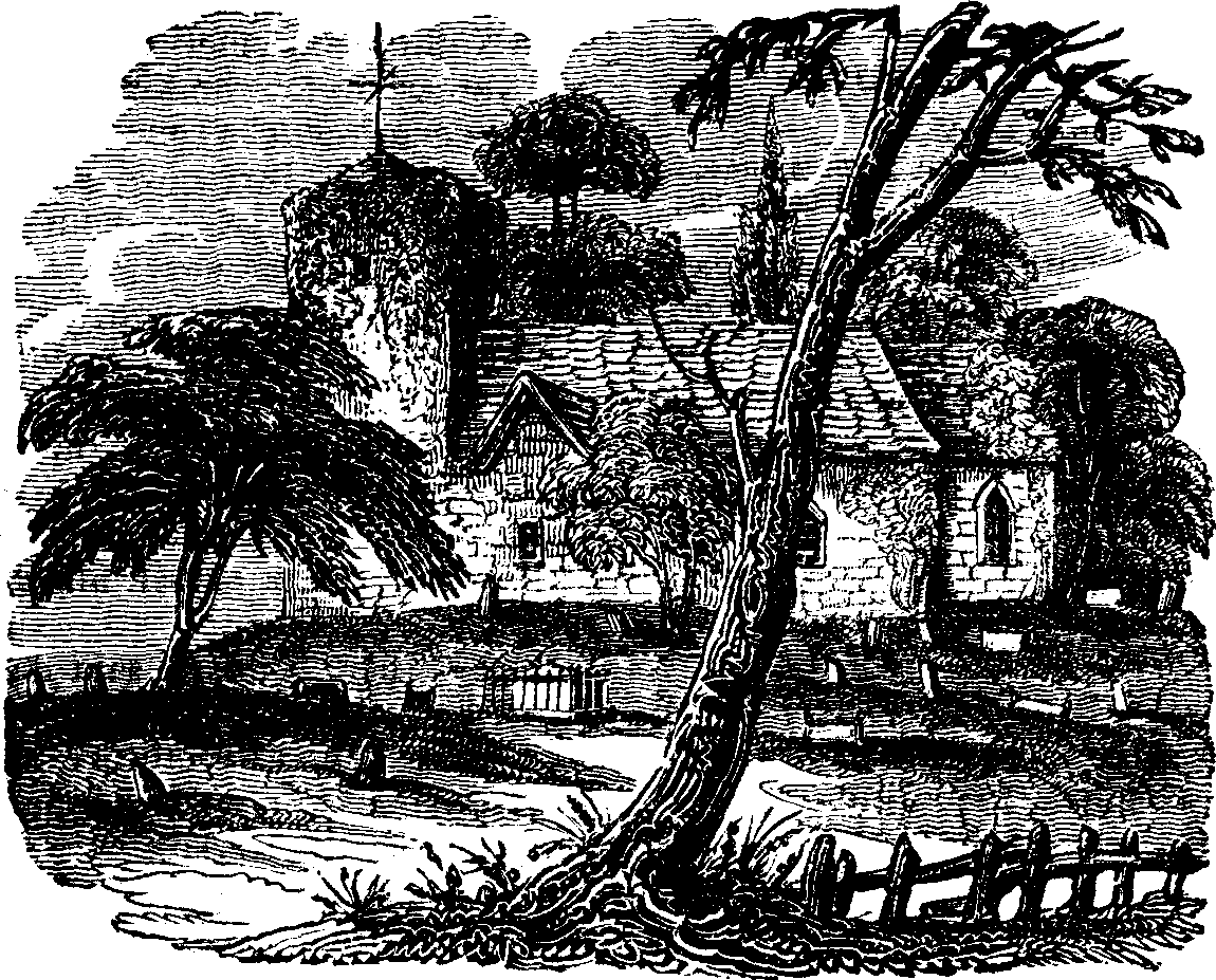 The "ivy-mantled" church, represented in the above vignette, is dedicated to St. Peter and St. Paul, and consists of a chancel, nave, and south aisle, with a low square tower at the west end, containing three bells. Within the church are a few interesting monuments, among which is one to the memory of Robert Rampton, who died in 1585 and was yeoman of the chamber to Edward VI., and the Queens Mary and Elizabeth. It stands in the south aisle, with an inscription on a brass plate against the wall, underneath which is an altar tomb covered with a slab of black marble, on which are the effigies, in brass, of Robert Rampton, and his wife Margaret, who died in 1590.