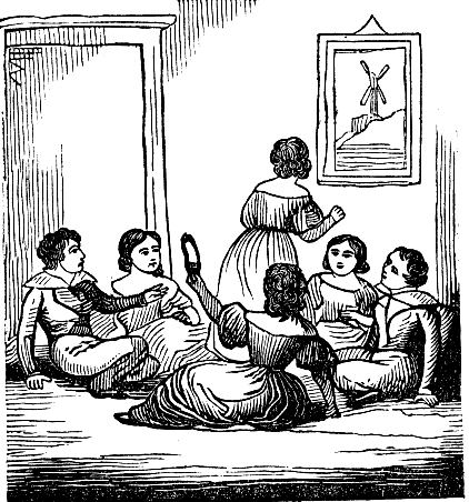 One evening—it was winter, and the hills and fields were covered with snow, but the moon shone bright on the frosty windows, and the fire was burning cheerfully in the grate; it was such an evening when one likes to enjoy the pleasures of a song or story. You may imagine yourselves on such an evening seated around the table, something like the knights of old, whose pleasure it was to relate their wonderful deeds of arms, when they returned from the "Holy Land," or from some noble deed of knightly prowess; but the stories you shall hear are very different from those, as the picture you see before you indicates. They are chiefly stories for children, and are such as relate more particularly to the affections of the heart. They may be "Fairy Tales," or they may be household narratives of facts, such as occur in the every-day life of a child. If the moral be good and pure, and the mind interested and made better, the end is accomplished.