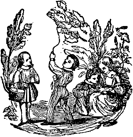 In one part of the garden a number of children were playing. They piled up heaps of pebbles, jumped over them, and laughed heartily if one did not spring clear over, or tumbled down. When Tony came near they cried out, "Welcome, Tony!" and shook his hand, and looked kindly in his face, gathered some fruit, and led him to the other side of the garden, where there was a grove of trees which bore gold and silver fruit. These trees looked just like those the angels bring to children on Christmas-eve. The children shook the trees, and the fruit fell off till the ground was all covered; then they gathered it up and offered Tony an equal share with themselves, and gave him a diamond needle, and instructed him to string them into a necklace, and threw it over his shoulders. Then they presented him with a sweet orange for his mother, and a pomegranate for his father, which they said must be opened very carefully. "He will know what use to make of its contents," continued they. "Tell him we send it as a recompense for the meal which thou gavest us out of his store."