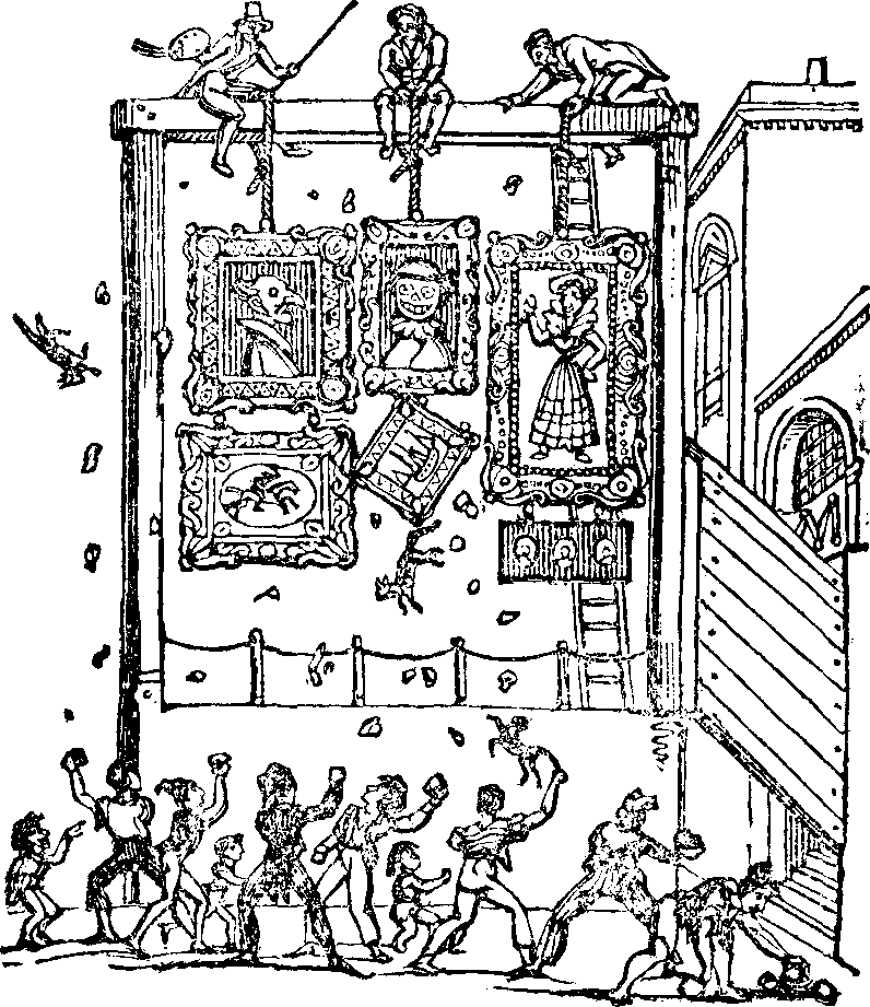 "I beg your pardon," rejoined the theatrical gentleman; "but till I can forget the blunderbuss fired from the upsetting coach, the cobweb over the poor's-box, and the gay parson and undertaker at the harlot's funeral, I cannot [pg 329] allow of the comparison. Besides, I admire Hogarth for another reason: did he consider an engraver's to be an infradig. profession? No, for he was the engraver of his own works."