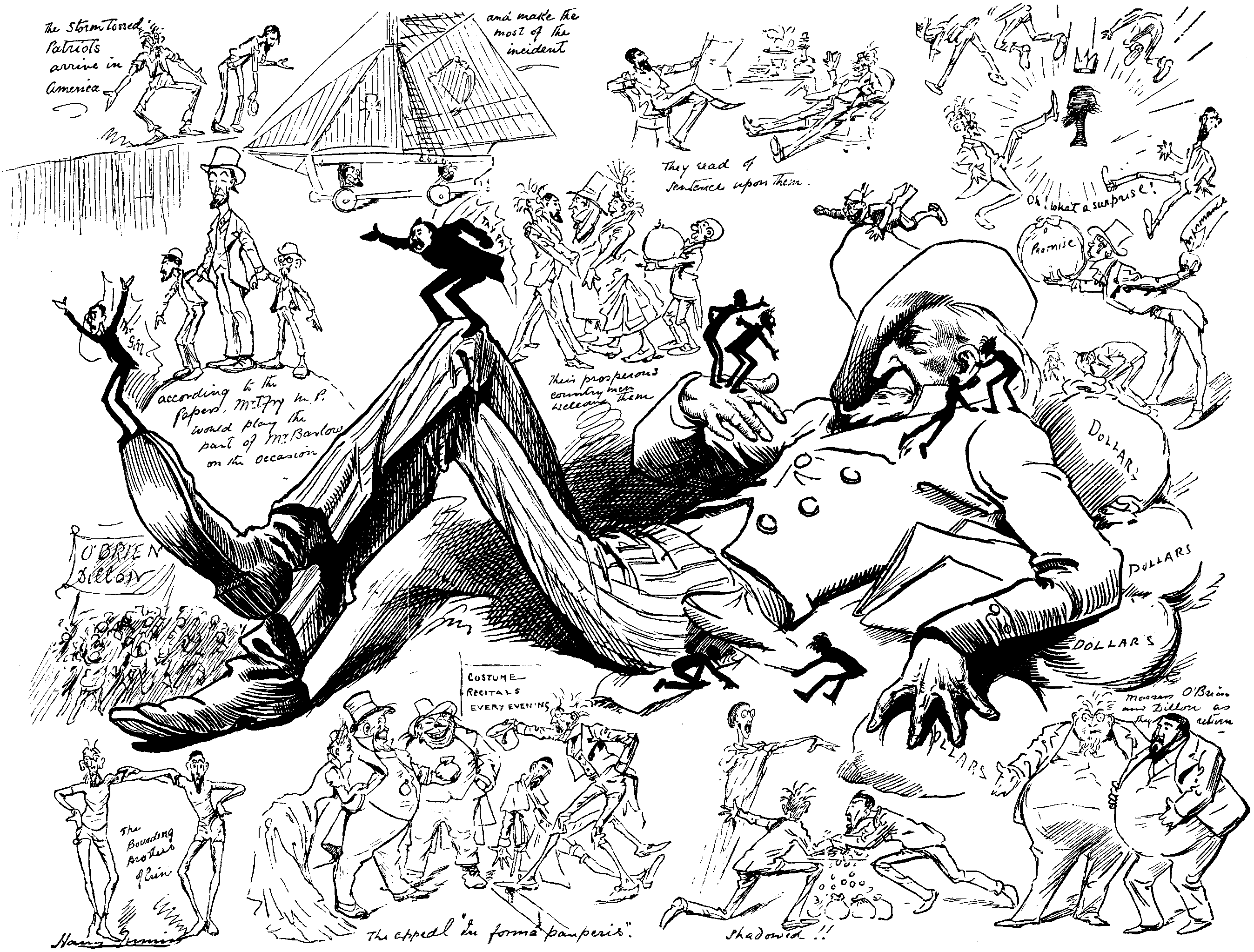 Thinking of these things, I was standing by Sergeant-at-Arms' chair; heard a scuffling noise behind; looked round, and lo! there was PARNELL entering House by Distinguished Strangers' Gallery, descending by swarming down the end pillar, which supports Gallery from floor of House.