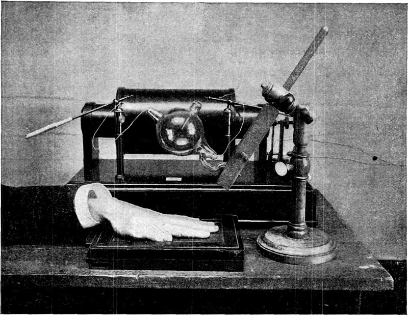 The Ruhmkorff coil in the background; the Crookes tube in front of it; under the hand is the photographic plate in its plate-holder.