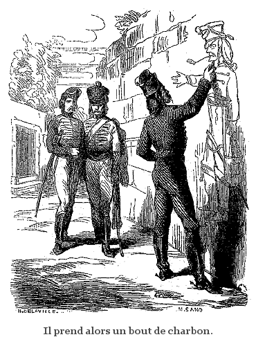 «Vous souvenez-vous, dit une autre voix, de l'arrivée de Jacques au régiment, la veille de***?—-Ah! brave Jacques! il avait seize ans, dit un autre interlocuteur; il avait l'air d'une jolie petite demoiselle. Ils étaient là cinq ou six enfants de famille, débarqués depuis une heure, enveloppés de surtouts fourrés par leurs mamans, gentils, bien peignés, roses, et pas trop contents de coucher à l'auberge en plein champ. Jacques était là aussi avec sa petite mine, pâle déjà, un petit commencement de moustache et sa petite chanson entre les dents. L'un disait; Celui-là est le plus ridicule de tous; il veut faire le luron, et il est déjà blanc comme un linge. Un autre disait: M. Jacques est le César de la société; au premier coup de canon, il chantera sur un autre ton.—Lorrain... Qui est-ce qui se souvient du lieutenant Lorrain, avec son grand diable de nez, ses mauvaises plaisanteries, et son album de caricatures qui ne le quittait pas plus que son sabre? Un habile dessinateur, ma foi! et le meilleur tireur du régiment. Voilà que mon animal, à la lueur du feu du bivouac, s'amuse avec un bout de charbon à vous crayonner la charge de Jacques et de ses petits compagnons, avec des éventails et des ombrelles; il avait écrit au-dessous: Gens riches allant à la bataille. Jacques passe derrière lui, se penche sur son épaule, et dit avec l'air doux et gentil qu'il a toujours conservé: «C'est très-joli, cela!—Vous en êtes content? dit Lorrain.—Très-content, répond Jacques.—Et moi aussi,» reprend Lorrain. Tout le monde de rire. Jacques s'assied sans se déconcerter le moins du monde, et me prie de lui prêter ma pipe. J'avais envie de la lui casser sur la figure. «Est-ce que vous n'en avez pas une?—Non, répondit-il; je n'ai jamais fumé de ma vie; j'ai envie d'essayer: comment s'y prend-on?—On allume de ce côté-là et on la met dans sa bouche, et puis on tire de toutes ses forces jusqu'à ce que la fumée sorte par le côté opposé.» Jacques secoue la tête d'un air de simplicité et prend la pipe. Nous espérions le voir tousser ou s'enivrer; chacun charge la sienne et la lui présente l'une après l'autre, en lui versant des rasades d'eau-de-vie à griser un boeuf. Je ne sais pas s'il les escamotait; mais sa figure ne fit pas un pli, son gosier n'eut pas une convulsion; il but et fuma la moitié de la nuit sans sortir de son sang-froid et sans se laisser entamer par la moindre taquinerie; on eût dit que sa nourrice l'avait élevé avec de l'eau-de-vie et de la fumée de pipe. Le capitaine Jean, que voilà, et qui se souvient bien de ce que je raconte, vint me taper sur l'épaule et me dire: «Vous voyez bien cet oiseau-mouche? Eh bien! je vous dis, Borel, que ce sera une de nos meilleures moustaches. Je connais cela; c'est une petite race de vieux buis bien sec, et c'est plus solide qu'une grande massue de fer. Son père est un brigand, mais un sabreur; celui-ci aura plus de sang-froid, et si un boulet ne le raie pas demain de mes tablettes, il fera vingt campagnes sans se plaindre de cors aux pieds. Le lendemain, chacun sait comme Jacques fit ses preuves et fut décoré sur le champ de bataille.—Vous croyez qu'il était glorieux après cela, dit le capitaine de dragons; qu'il sautait comme font les enfants à qui ces fortunes-la arrivent, ou bien qu'il s'en allait dans les petits coins, comme nous faisions, nous autres, pour regarder sa croix et la baiser? Il avait l'air aussi indifférent à cela qu'il l'avait été à la caricature de Lorrain, au premier feu et à sa première blessure. Il reçut toutes les poignées de main d'un air franc et amical, mais sans montrer ni étonnement ni joie. Je ne sais pas ce qui peut faire rire ou pleurer Jacques, et, quant à moi, je me suis souvent demandé si ce n'était pas un de ces spectres auxquels croient les Allemands.—Vous n'avez donc pas vu Jacques amoureux? dit M. Borel. Alors vous l'auriez vu fondre comme la neige au soleil; il n'y a que les femmes qui aient du pouvoir sur cette tête-là; aussi y ont-elles fait de fiers ravages! En Italie...» M. Borel s'interrompit, et je compris que quelqu'un, Eugénie sans doute, lui avait fait signe de se taire. Cela me donna une impatience, une curiosité et une inquiétude épouvantables.