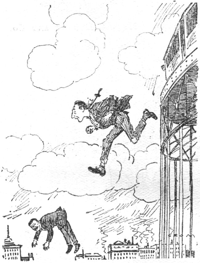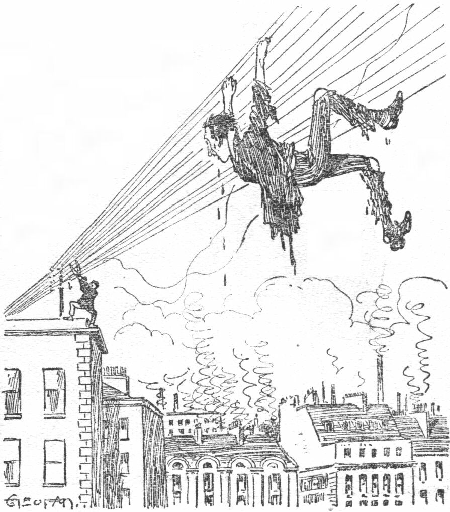 "At last Bill is seized with a notion. He throws himself on to the telephone wires, and, hanging by his hands, manages to convey himself across to the houses on the opposite side of the road. You imitate him. As Bill arrives on the other side, he turns and cuts the wires on which you are crossing. Before the ends of the wires fall, however, you turn a quick somersault and land beside Bill. Once more there is a race over the roofs until Bill reaches a factory chimney. Down the shaft he dives. So do you. Into the furnace below, then out of it, the chase continues—it doesn't pause for a moment."