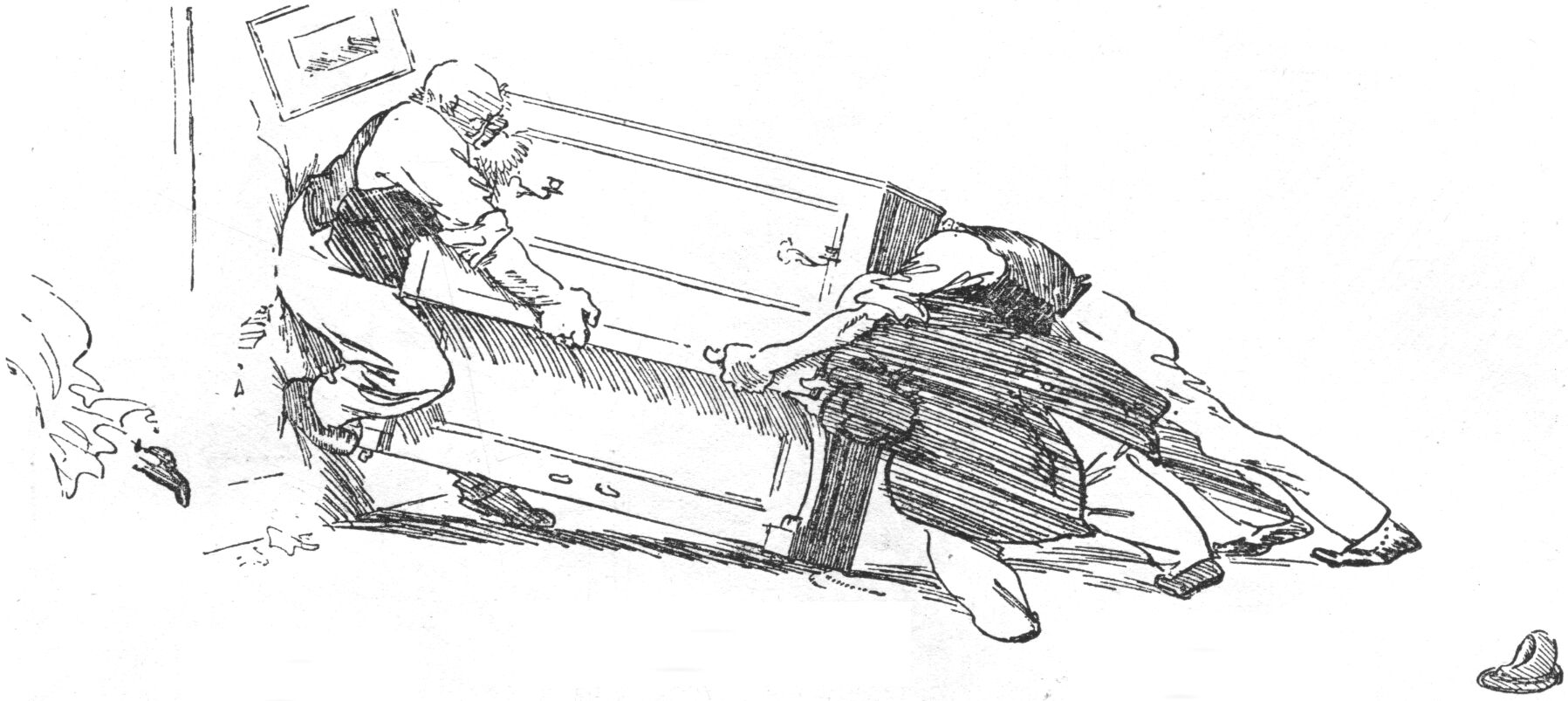 "Good," said the producer. "You see, the picture opens with Bill Bloodred, the champion prize-fighter, demanding certain documents from his aged uncle. As the latter won't surrender the papers. Bill gives him a swinging blow to the jaw, a few more heavy ones to various other parts of the body, and then proceeds to kick the old man to death as the latter lies helpless on the floor. It's one of those thrilling scenes the juveniles like so much! Then you come in and tackle Bill."
