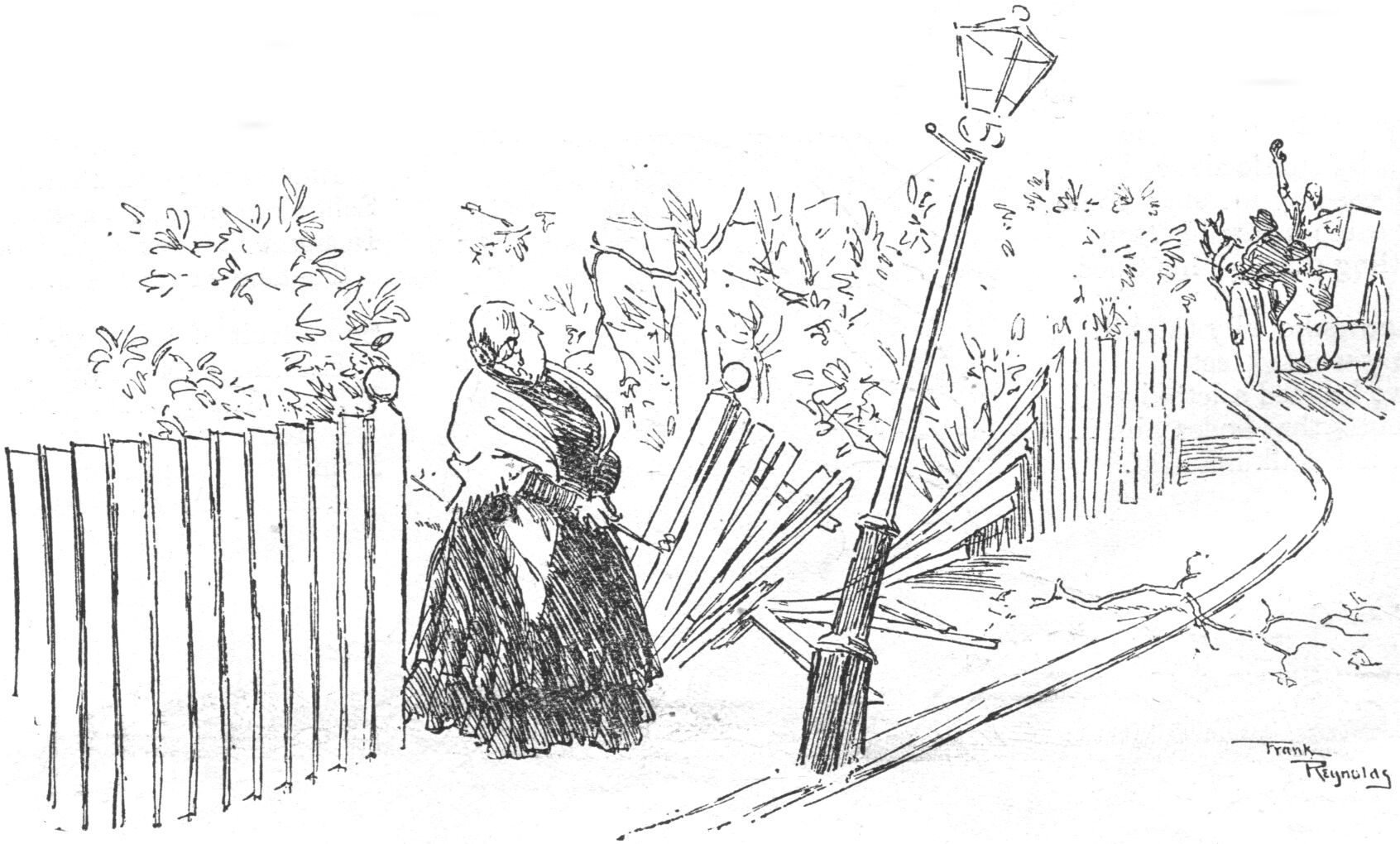 3rd hole (Czernowitch to Brest-Litowski).—CROWN PRINCE, taking the Przaritczow-Blokhod-Strypovitchi line, puts long-range shot into the Pripet Marches. MEHMED, after undermining greater part of the Bukowina, reports progress from the tee. FRANCIS-JOSEPH, reverting to clubs, misses tee-shot twenty-four times and retires exhausted to bath-chair. [pg 31] FERDIE's wind-cheater, badly sliced, trickles into the Warsaw whins and is lost. C.P., arrived at edge of Pripet Marshes, drops another ball, tops it into hazard, throws bag of clubs after it, and sends for another set. Hole abandoned, M. having taken thirty-nine shots and a life-line to get out of the Blokhod Swamp.