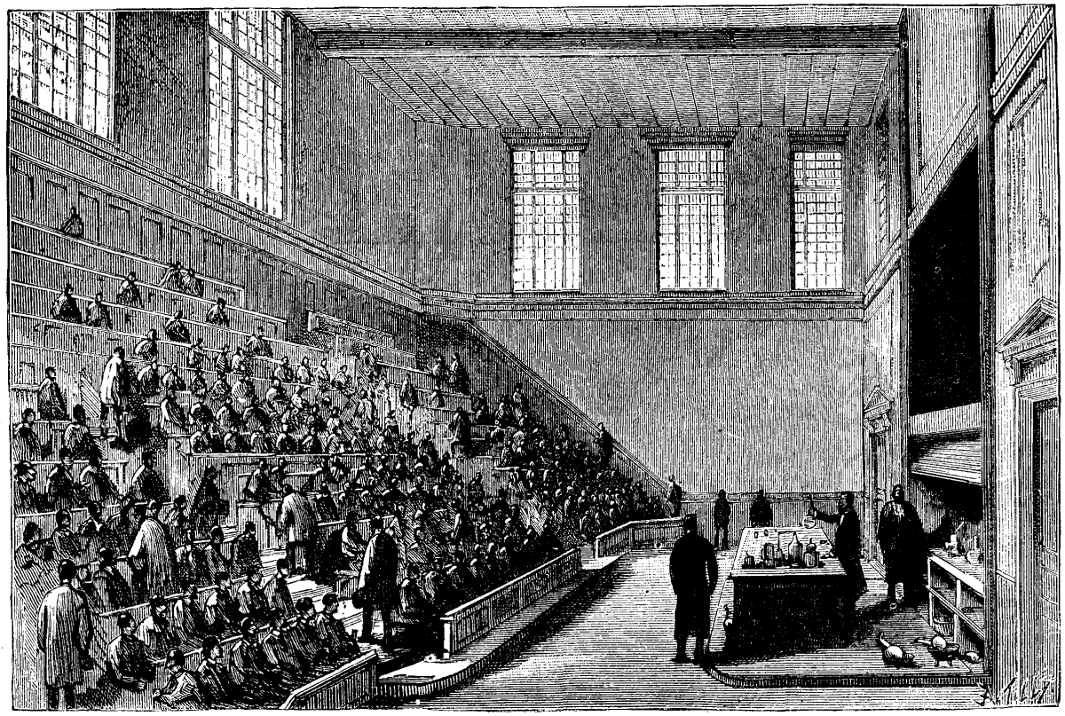 The amphitheater does not perceptibly differ from those of other schools. It consists of a semicircle provided with rows of benches, one above another, upon which the pupils sit while listening to lectures and taking notes thereof. Several blackboards, actuated by hydraulic motors, serve for demonstration by the professor, who, if need be, will be enabled, thanks to the electricity and gas put within his reach, to perform experiments of various kinds. Electricity is brought to him by wires, just as water and gas are by pipes. It will always be possible for him to support the theory that he is explaining by experiments which facilitate the comprehension of it by the pupils. The amphitheater is likewise provided with a motor which furnishes the professor with power whenever he has recourse to a mechanical application.
